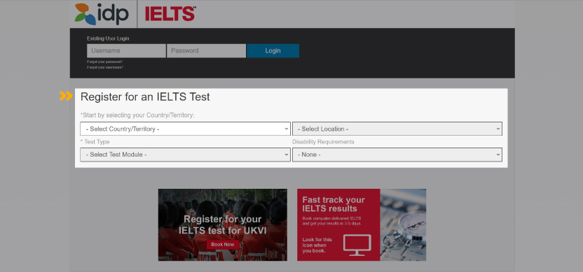با ورود به وبسایت آیلتس، مانند تصویر زیر در سمت چپ صفحه و در بخش Register For Your ILETS Test روی Book Now کلیک کنید. توجه کنید که گزینه سمت راست که با عنوان Register For Your ILETS Test For UKVI مشخص شده مخصوص متقاضیانی است که قصد سفر به کشور انگلستان و تمدید ویزای خود را دارند و نیاز است تسلط به مهارتهای مکالمه و شنیداری خود را اثبات کنند. بنابراین اگر آزمون مناسب شما همان گزینه سمت چپ است، روی آن کلیک کنید.