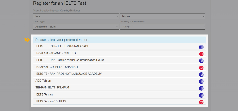 در بخش بعدی میتوانید مرکز آزمون آیلتس مورد نظرتان را انتخاب کنید. در سمت راست تصویر و در مقابل هر مرکز آزمون، دو علامت به رنگهای آبی و قرمز وجود دارد. علامت قرمز رنگ به معنای آزمون کامپیوتری آیلتس (Computer Delivered Test) و علامت آبی رنگ به مفهوم آزمون کاغذی آیلتس (Paper Delivered Test) است. توجه کنید که با انتخاب آزمون کامپیوتری آیتلس، بخشهای Listening ،Reading و Writing کامپیوتری ارائه شده و بخش Speaking با یک ممتحن به صورت حضوری یا از طریق تماس تصویری در مرکز آزمون ارائه میشود.