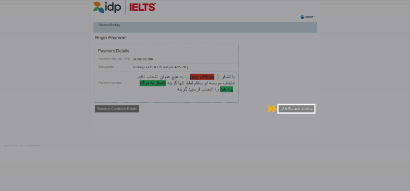 با کلیک روی Continue، وارد صفحهای میشوید که خلاصهای از مبلغ هزینه آزمون ایلتس را به شما نمایش میدهد. در این بخش ذکر شده که امکان پرداخت هزینه ثبت نام آیلتس به صورت آفلاین وجود ندارد و شما تنها میتوانید این هزینه را به صورت آنلاین پرداخت کنید. هزینه امتحان آیلتس در حال حاضر ۸۴،۹۰۰،۰۰۰ ریال (معادل ۸ میلیون و ۴۹۰ هزار تومان) برای آزمون کامپیوتری IELTS و ۸۸،۹۰۰،۰۰۰ ریال (معادل ۸ میلیون و ۸۹۰ هزار تومان) برای آزمون کاغذی آیلتس است. البته توجه کنید که این مبالغ به صورت علیالحساب گرفته میشوند. در نهایت مانند تصویر زیر با کلیک روی گزینه «پرداخت از طریق درگاه بانکی» میتوانید آن را پرداخت کنید.