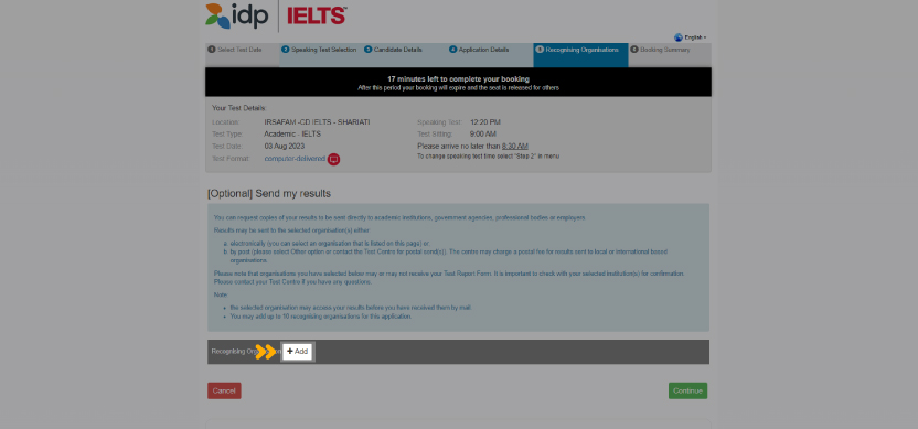 حالا به بخش Recognising Organizations هدایت میشوید که لازم است دانشگاههای مدنظرتان را برای گزارش نمره آیلتس انتخاب کنید. در ادامه روی Add کلیک کنید.