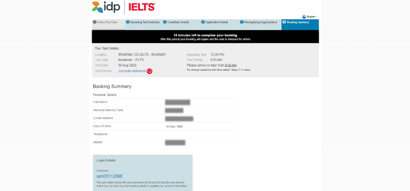 خلاصه اطلاعات وارد شده برای ثبت نام آزمون آیلتس