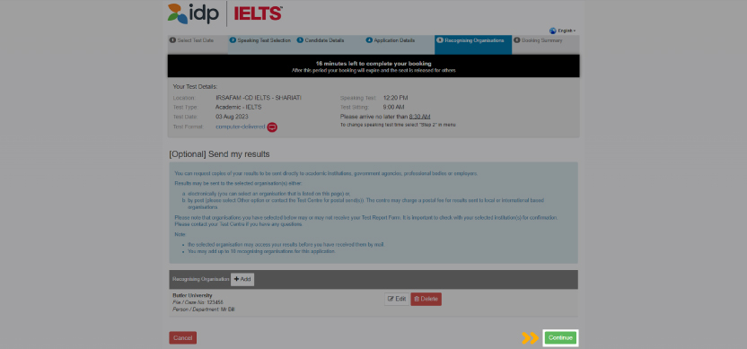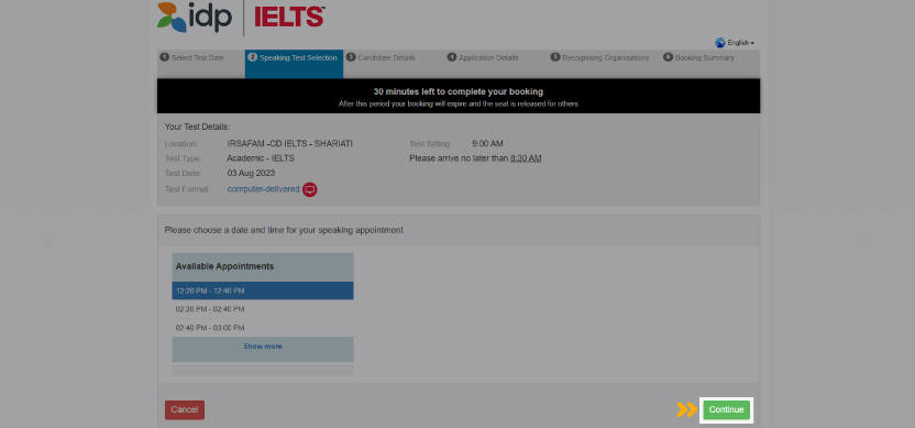 با کلیک روی Continue به بخشی هدایت میشوید که لازم است تاریخ و ساعت بخش اسپیکینگ امتحان آیلتس را انتخاب کنید. به طور معمول بخش اسپیکینگ آیلتس ۲۰ دقیقه طول میکشد و از میان زمانهای خالی موجود، میتوانید زمان موردنظرتان را انتخاب کرده و در نهایت روی Continue کلیک کنید. فراموش نکنید حتما نیم ساعت قبل از زمان شروع بخش اسپیکینگ در مرکز آزمون حضور داشته باشید.